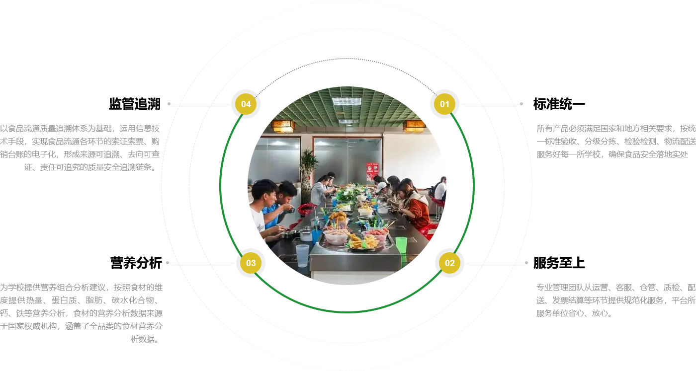 校园营养餐聚焦中小学,着眼公共食堂食品安全,依托标准的运营与严格的管理,以数字化食安监管平台为核心,确保食材供应实现全溯源、全检测, 保障食品安全,用心关爱学生每一餐。